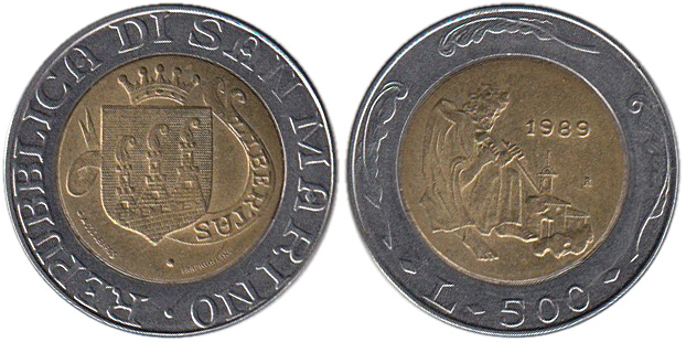 500 лир Ø28,5 мм. Bi-metalic, 6,80 г.